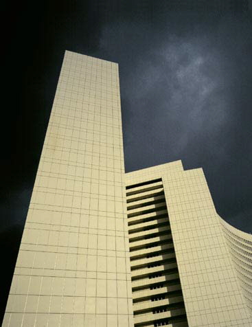 das Hermes Versicherungs -Gebäude in Hamburg BahrenfeldZwischen zwei heftigen Gewitterschauern beleuchtet die späte Nachmittagssonne das Gebäude vor einem schwarzblauen Gewitterhimmel