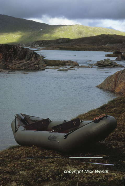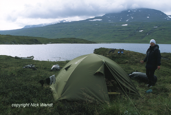 Zelt. Dahinter der See .... und noch ein See .... Seen, Stromschnellen, Katarakte. Eingerahmt von Bergen, Felsen, Geröllhalden. Fünf Tage