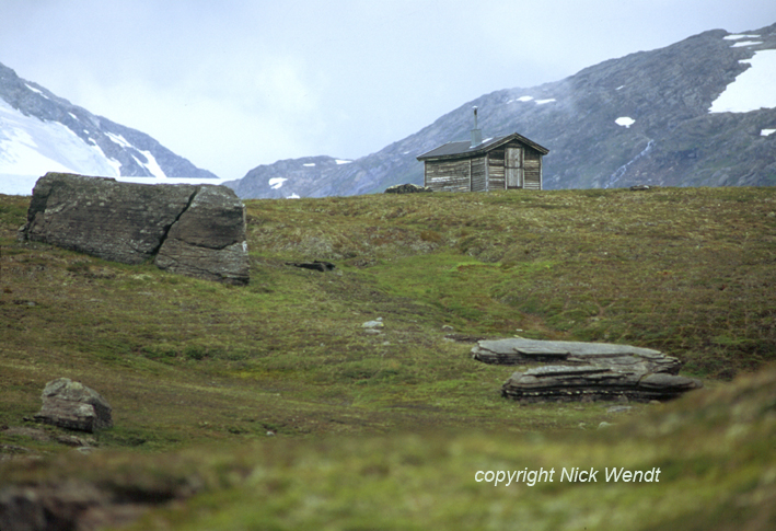 einen halben Kilometer. Ein Moorschneehuhn brütet hier und gerät in Aufregung wegen der ungewohnten Eindringlinge. Auf der Höhe des Felsens thront einsam und unbewohnt eine Renwardstuga, die