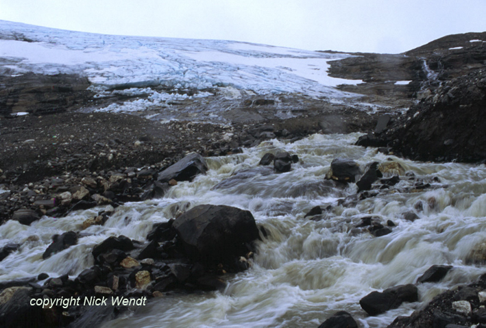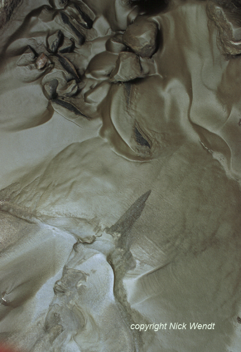 denen das Wasser zum großen Teil schon verdunstet ist. Der Schlamm dieser Flecken besteht aus dem ungeheuer fein gemahlenen Sand aus dem Gletscher, der an Feinheit Seesand bei weitem noch übertrifft.