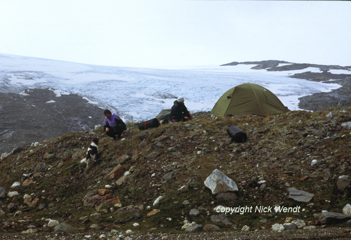 Niederschlag am Ende des Sees ankommen. Auch hier rauscht wieder ein lauter Katarakt, so daß wir nur in einiger Entfernung zelten können. Eingebettet zwischen Berghang und Felsen