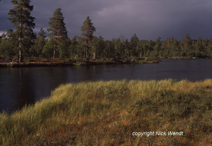 rechts im Wald versteckt, eine Touristenhütte mit Namen Rövollen. Vom Fluß aus und auch vom Ufer aus ist sie nicht sichtbar.